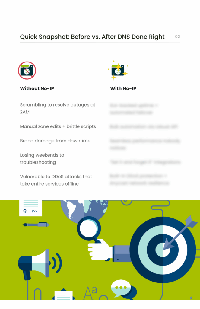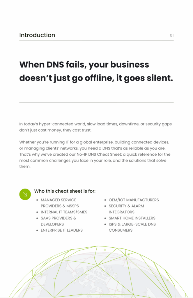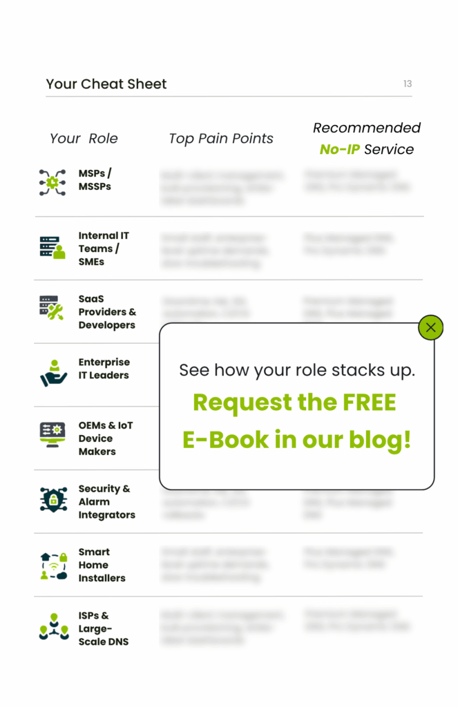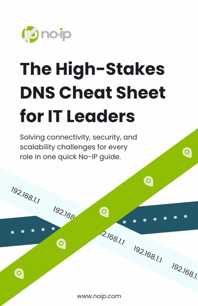 No-IP’s new “The High-Stakes DNS Cheat Sheet for IT Leaders” e-book is an an extensive, but practical guideguide to help assist users who may be running IT for a global enterprise, building connected devices, or managing clients’ networks. You may be an IT figurehead who needs a DNS service that’s reliable and easy to manage. That’s why our e-book is formatted like a DNS Cheat Sheet: a quick reference for the most common challenges you face in your role, and the solutions that solve them.